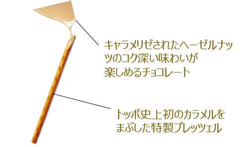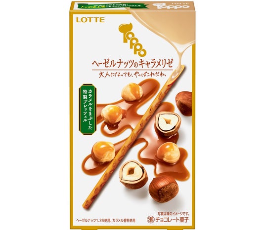 - 「トッポ<ヘーゼルナッツのキャラメリゼ>」は、トッポ史上初のカラメルをまぶした特製プレッツェルに、キャラメリゼされたヘーゼルナッツのコク深い味わいが楽しめるチョコレートを、最後までたっぷり閉じ込めました。