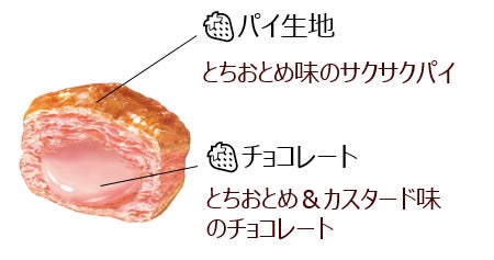 - 64層のとちおとめ味のサクサクパイととちおとめ&カスタード味のチョコで、贅沢なとちおとめタルトの味わいを表現しました。