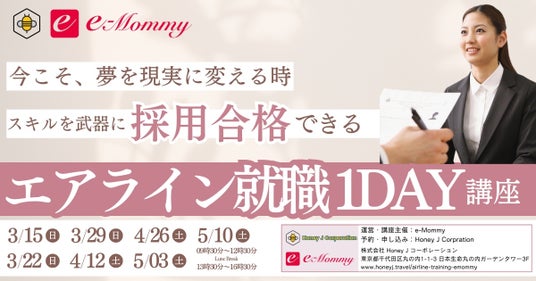 このような状況を受け、Honey J コーポレーションとe-Mommyは、エアライン就職を目指す方々を徹底支援するため、『エアライン就職1DAY講座』を開講する運びとなりました。