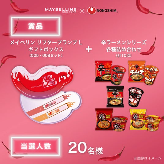 「辛ラーメン×メイベリン」コラボを記念して、SNSキャンペーンを開催。辛ラーメン・メイベリン ニューヨーク公式XをWフォローの上、投稿をリポストしてくれた方、または辛ラーメン公式Instagramをフォローの上、投稿に「いいね」をしてくれた方の中から、抽選で合計40名様に「メイベリン リフタープランプ L ギフトボックス(005、008のセット)&辛ラーメンシリーズ各種詰め合わせ(計10点)」が当たります。