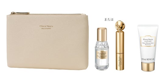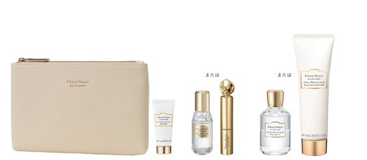 花々の贅沢なうるおいと香りを全身で堪能できる、選べるフレグランスとヘアケアアイテムがセットになった限定キット。ハンドクリームのミニサイズとオリジナルポーチ付き。