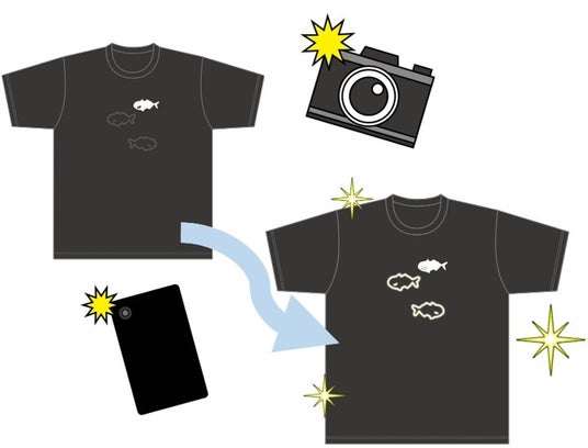 サンシャイン水族館オリジナル ヒカリキンメダイフラッシュプリントTシャツヒカリキンメダイの眼の下にある発光器をイメージしたTシャツで、カメラでフラッシュ撮影すると、光に反応して反射します。