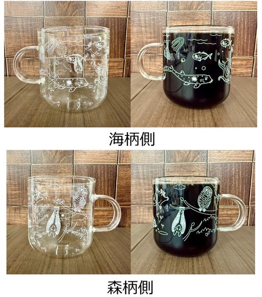 サンシャイン水族館オリジナル 真夜中の海と森 耐熱グラスマグカップ海と森両方の生き物が半面ずつ描かれている耐熱グラスのマグカップで、お茶やコーヒーを注いでカップの中が真っ暗になると、生き物たちのイラストが浮かび上がります。