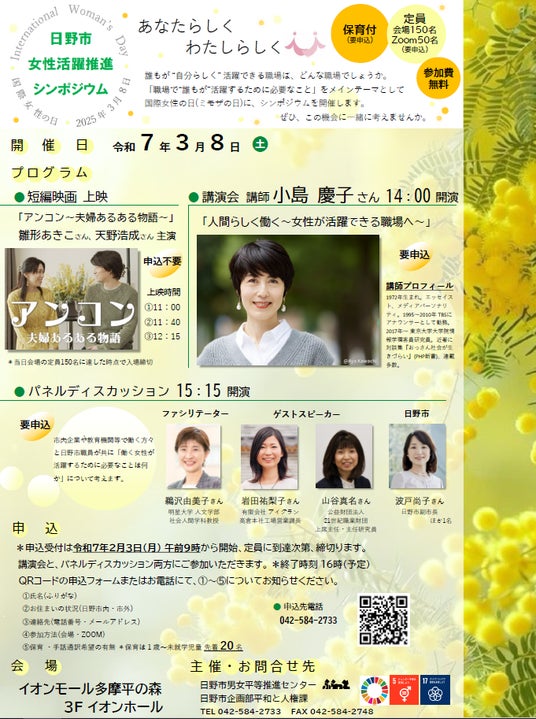 女性活躍推進法の期限まで1年となる今、小島慶子氏による講演を中心に、事業者、研究者、行政職員がそれぞれの立場から、柔軟な働き方、働き甲斐、ワークライフバランス、アンコンシャスバイアスなどをキーワードにしたパネルディスカッションを交わすことで、職場における女性活躍に向けた積極的取り組みを促し、女性が生き生きと輝くまち日野を目指します。