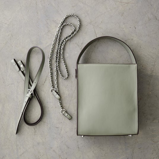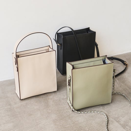 ワンショルダー、ロングショルダー、チェーンと3種類のハンドルでコーディネイトが楽しめるスクエアバッグ。