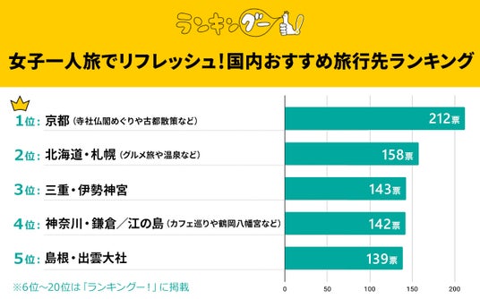 株式会社CMサイト(本社:大阪府大阪市、代表取締役社長:柴原 誠治)が企画編集する、「ちょっと気になる」を調べたランキングサイト『ランキングー!(https://rankingoo.net/)』は、『女子一人旅でリフレッシュ!国内おすすめ旅行先ランキング』の結果を、投票者のコメント付きで紹介する記事として公開しました。