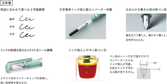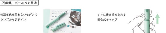 年齢・性別・利き手問わず、ペンを立てて書く・寝かせて書く、どんな書き方の人にも日常的にお使いいただける新機能を搭載した万年筆と同デザインのボールペンです。