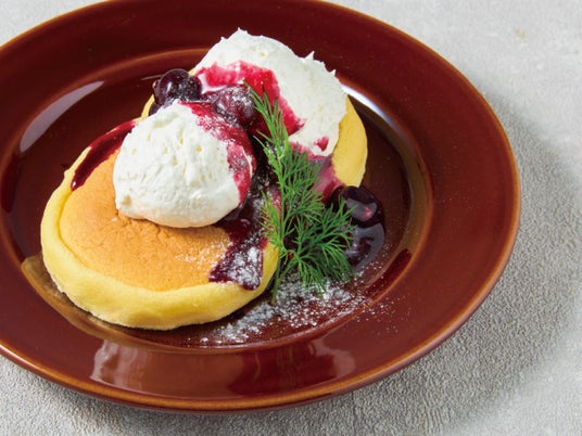 エプロントで人気のスフレパンケーキシリーズに新作が登場。ふわふわでしっとりとしたスフレパンケーキに酸味のある軽やかなクリームチーズ、ごろっとした果肉を残したブルーベリーソースをトッピングし、さわやかな香りのハーブ(ディル)を添えています。