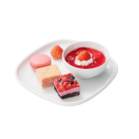 いちごのプリン、プチケーキ、マカロンなどいちご味を豊富に取り入れたさまざまなデザートを楽しめます。プチケーキは丁寧に焼き上げたクレープ生地と甘酸っぱいいちごクリームを重ね合わせたミルクレープと、とちおとめ苺果汁を使用し、いちごとブルーベリーの果肉を敷き詰めたベリーケーキの2種類を用意しました。