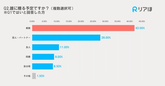「家族」への贈り物が最多で42%を占め、バレンタインが単なる恋人同士のイベントではなく、家族とのコミュニケーションの場になっていることが分かります。また、「自分用」も一定の割合を占めており、自分へのご褒美としてバレンタインチョコを購入する文化が浸透していることがうかがえます。