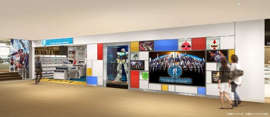 国内線側通路には1/10サイズのRX-78-02ガンダム(THE ORIGIN Ver.)の立像展示やマルチモニターでの映像放映を行い、店内の下がり壁にはRG[リアルグレード]のガンプラパッケージの美麗グラフィックが勢揃いしたデザインを施しています。