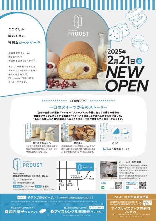 2025年2月21日(金)に、札幌市清田区に洋菓子店『Patisserie PROUST』をオープンすることをお知らせ致します。