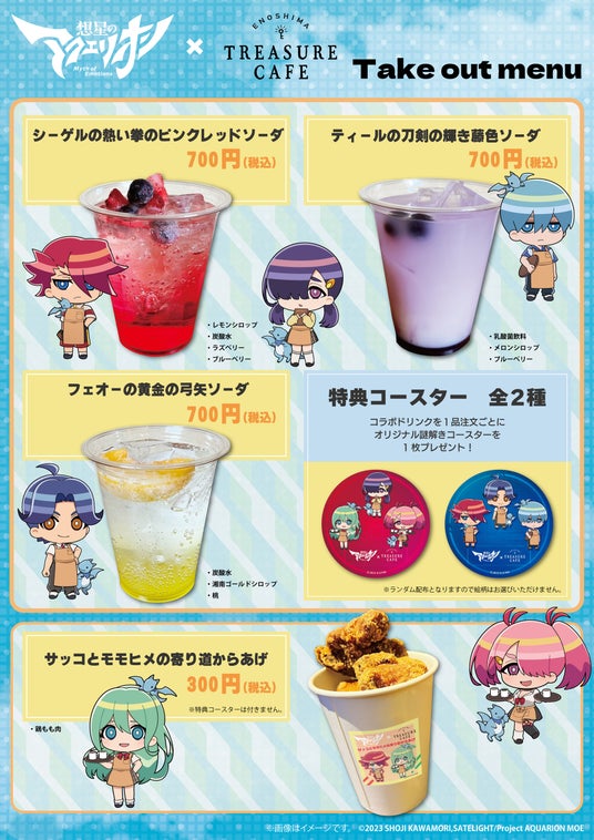 ENOSHIMA TREASURE CAFEでは従来のメニューにプラスして、『想星のアクエリオン Myth of Emotions』オリジナルコラボドリンクとテイクアウト商品の提供を実施いたします。