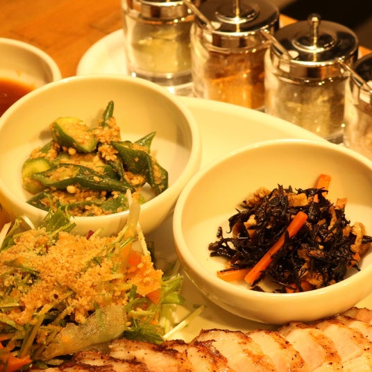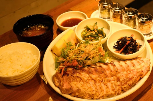 『やきとん木々家』の栄養定食ランチは、メイン、サラダ、小鉢、ご飯、味噌汁、食後のパイナップルなど食べる人の明日以降のコンディションまで考慮したオールインワン定食です。低温調理と独自の加熱方法で仕上げた豚ロース肉または鶏胸肉のどちらかをお選びいただけます。