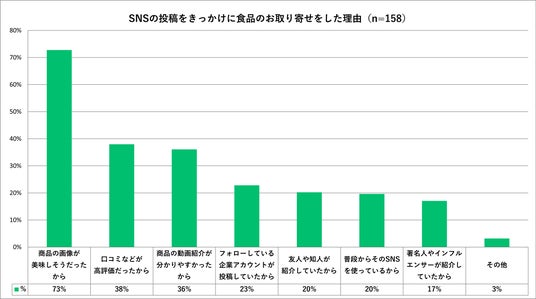 SNSの投稿をきっかけにして食品通販をした理由について、「商品の画像が美味しそうだった(73%)」「口コミなどが高評価(38%)」「動画での紹介が分かりやすい(36%)」が上位になりました。特に商品画像、動画などの視覚的なコンテンツは購買意欲を高める傾向があると言えます。