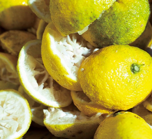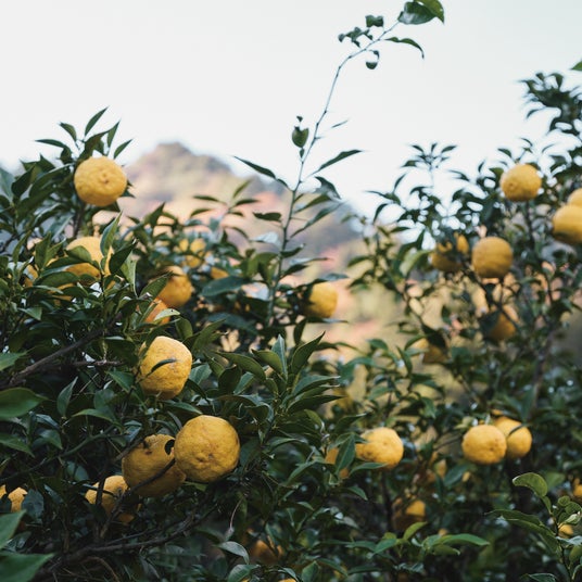 素材の産地である徳島県木頭地区の「黄金の村」は、雨量が多く寒暖差が激しい山間部にあり、この地域特有の気候ゆえに、香り高く酸味の強いゆずが育ちます。旬シリーズでは、その果実を収穫して24時間以内に搾った果汁*5や、果皮を蒸留することで生まれる蒸留水*3と精油*1をたっぷり使用。また、今回は種からもエキス*4を抽出することで、素材がもつパワーを余すことなく製品に詰め込みました。
