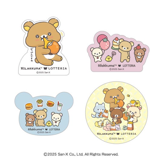 スマホケースや、ノートなどのデコレーションに使える、1枚でも存在感のあるサイズのステッカーです。「BASIC RILAKKUMA Favorite Things」シリーズのデザインが2枚、ロッテリア限定の描き下ろしデザインが2枚の計4種入りです。それぞれ春らしいピンク色、黄色、水色、白色の4色を基調にしています。