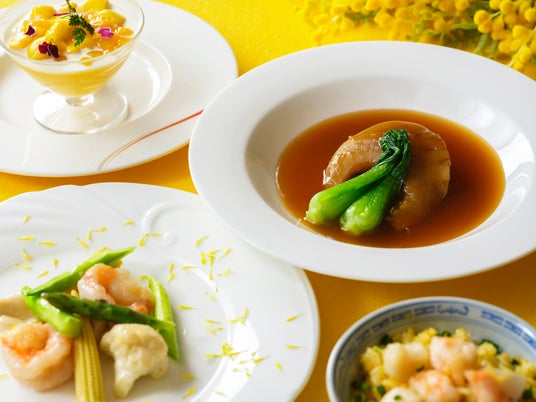海老とアスパラガスの炒めもの、ふかひれの姿煮込み、海の幸の旨味が詰まった炒飯、マンゴープリンなどハッピーイエローの彩りを取り入れた全6品のコースです。