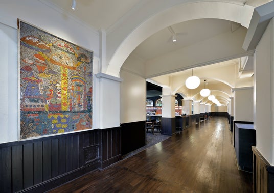 卒業生の作品(左)、アーチ型の天井、廊下の素材は小学校時代のまま