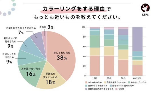 20代では約80%の女性がヘアカラーリングをしていると回答。また、40代以外の女性の半数以上が「自己表現」のためにヘアカラーリングをしていると回答。