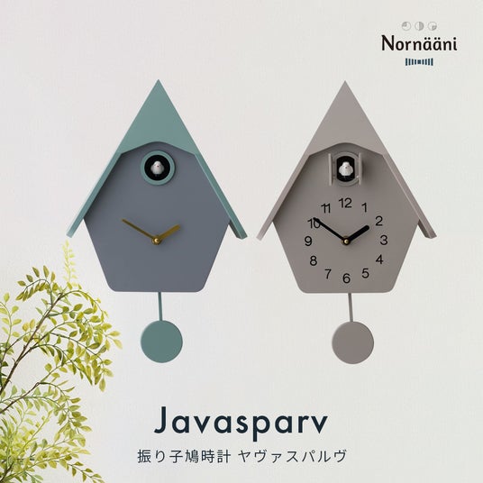 Javasparv(ヤヴァスパルヴ)とんがり屋根の振り子付き鳩時計。小鳥は白文鳥、カラーによって文字盤や配色の異なる「グレー」「グリーン」の2色展開。