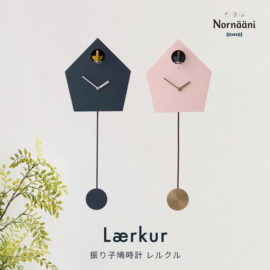 Lærkur(レルクル)五角形の振り子付き鳩時計。積み木のような小鳥と長い振り子がアクセント。カラーによって配色が異なる「グレー」「ピンク」の2色展開。