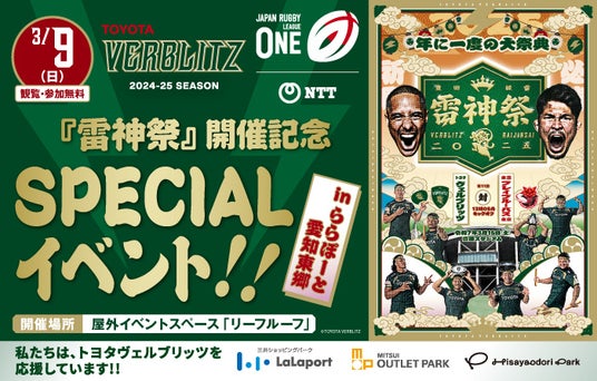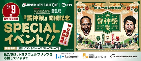 三井不動産商業マネジメント株式会社(本社:東京都中央区、代表取締役社長:大林 修)が運営する、三井ショッピングパーク ららぽーと愛知東郷では、2025年3月15日(土)に豊田スタジアムで行われるトヨタヴェルブリッツのホスト試合「雷神祭」を大いに盛り上げる体験型イベント「『雷神祭』開催記念SPECIALイベント!!inららぽーと愛知東郷」を3月9日(日)に実施いたします。