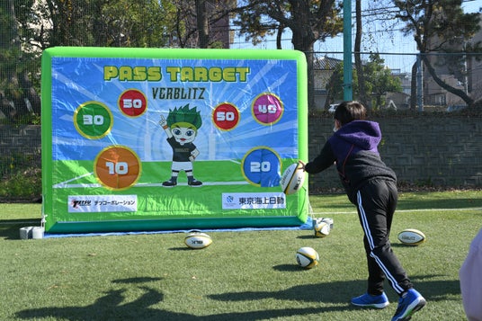 トヨタヴェルブリッツオリジナルのパスターゲット目掛けてラグビーボールを投げよう!特典に応じてお菓子をプレゼント!