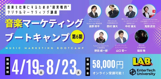 音楽業界が創った、音楽業界の就職・キャリアに1番近いオンラインスクール「エンターテック・ユニバーシティ」を運営するエンターテックエデュケーション株式会社(本社:東京都渋谷区、代表取締役:山口 哲一)は、音楽マーケティングスタートアップの株式会社LAB(本社:兵庫県神戸市、代表:脇田 敬)と共同で、実戦型音楽マーケター育成プログラム「音楽マーケティングブートキャンプ 第6期 ~音楽を仕事にするための"超実戦的"デジタルマーケティング講座~」を2025年4月より開講いたします。ただいま受講生を募集中です。