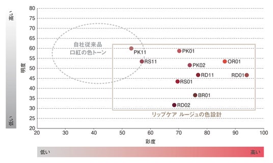 カラーは、敏感な肌や唇の色を考慮し、明度を抑えて彩度を高めに調整した色設計を採用。
