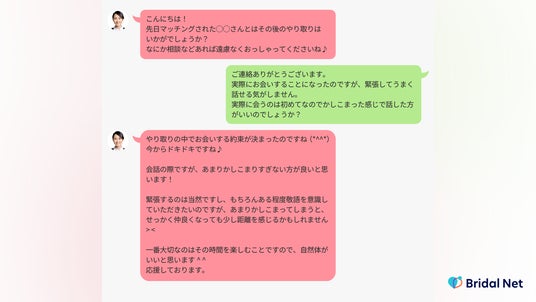 婚活者の中には、「バレンタインデー付近にお会いする際に、女性からお菓子を渡した方がいいのか悩みます。また渡した後のやりとりが中々続かないです(30代女性)」といったお悩みの声もあり、そのような声に対し、ブライダルネットでは婚活のプロ(=婚シェル)によるメッセージサポートを提供しています。