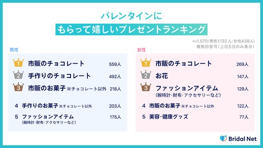・バレンタインに貰って嬉しいプレゼントは男女共に「市販のチョコレート」が1位