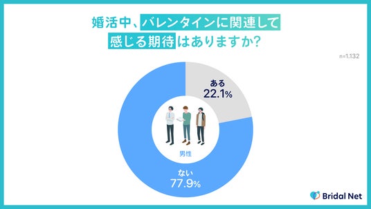 また、男性側の意識も同様で、77.9%がバレンタインに特に期待していないことが判明。この結果から、婚活中のバレンタインへの関心は、男女ともに低いことがわかります。