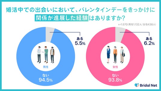 調査の結果、「バレンタインをきっかけに関係が進展した」と回答した人は男性 5.5%、女性 6.2%と、大多数の人は進展したことがないという結果に。日本のバレンタインは女性が好きな男性にチョコを贈る日として知られていますが、婚活の場では積極的に活用されていない実態がうかがえます。