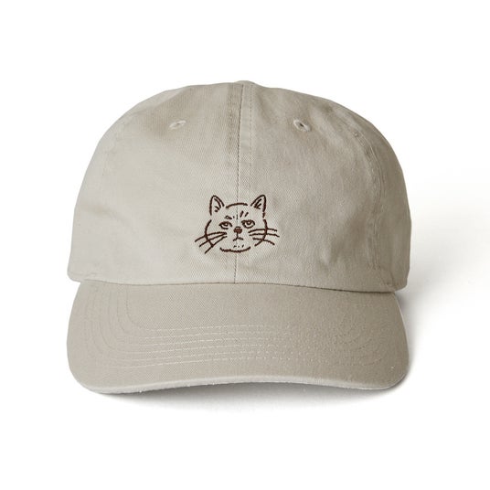 ブランドを象徴する「じっと見ネコ」の顔が刺繍されたベージュカラーのキャップ。