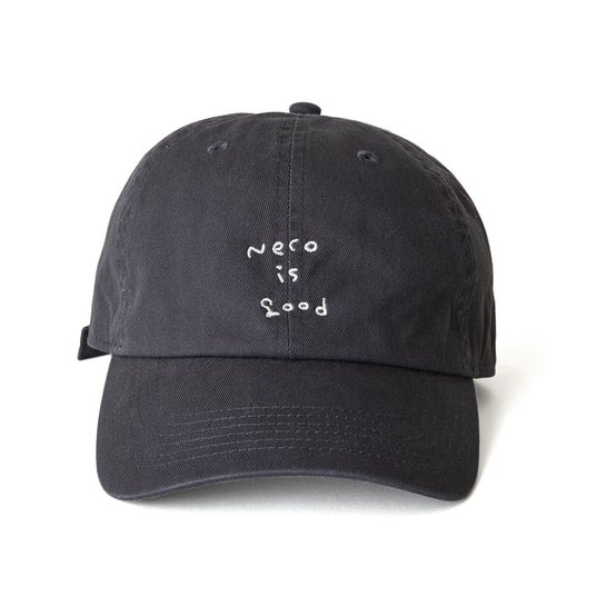 ゆるい手書き風刺繍メッセージに癒される「Neco is good」のチャコールカラーのキャップ。