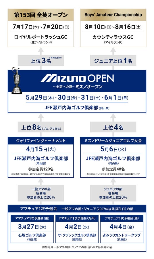 本大会は、1971年のミズノ主催大会「美津濃ゴルフトーナメント」を前身とし、1998年からは「全英オープン」の出場権が与えられる大会として開催しています。