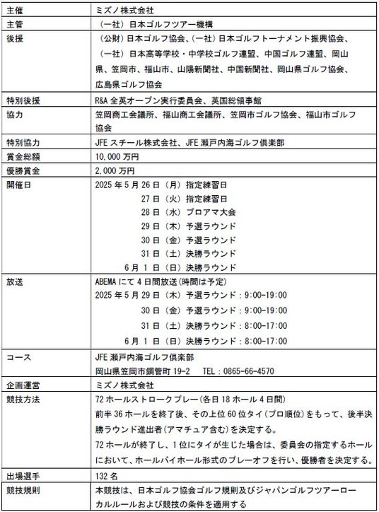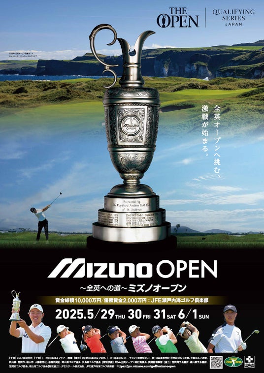 ミズノは、ジャパンゴルフツアー(国内男子ゴルフトーナメント)「~全英への道~ミズノオープン」を2025年5月29日(木)~6月1日(日)の4日間、JFE瀬戸内海ゴルフ倶楽部(岡山県)にて開催します。
