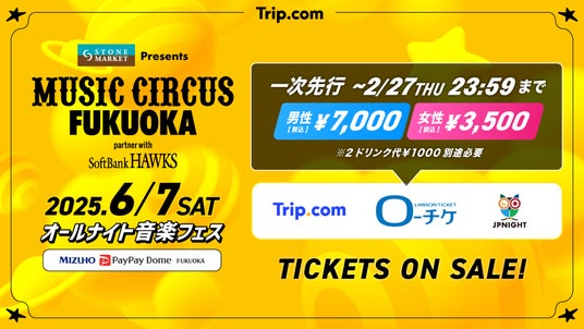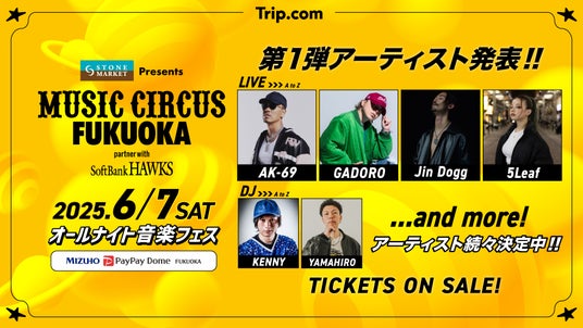株式会社TryHard Japan(大阪市中央区)は、2025年6月7日(土)にみずほPayPayドーム福岡で開催されるオールナイト音楽フェス「STONE MARKET Presents MUSIC CIRCUS FUKUOKA partner with SoftBank HAWKS」の第1弾出演アーティストを発表いたします。