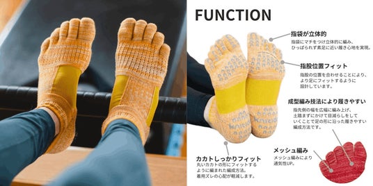 足裏のグリップ、土踏まず部分には強力ストレッチ素材を搭載した人気のシリーズ。足の安定と持久力アップを実現し、ピラティスシーンで大活躍する1足です。