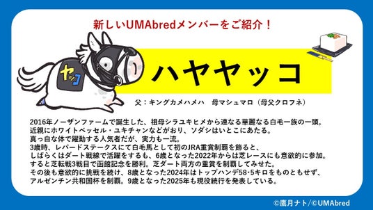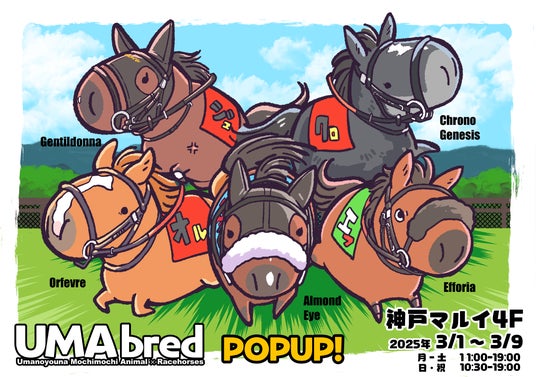 2025年3/1(土)より、実在の競走馬・引退馬を「UMA」(ウマのようなモチモチアニマル)として書き下ろすグッズブランド「UMAbred」のPOPUPイベントを、兵庫県 神戸マルイ 4F にて「UMAbred POPUP!」として開催いたします。