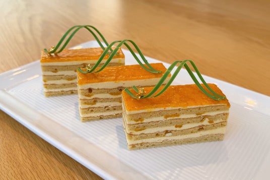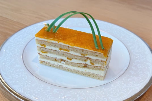 アーモンド生地とバタークリームの層が楽しめるベルギーの伝統菓子「ミゼラブル」は、シンプルながらも丁寧な製法によって素材の持ち味を最大限に引き出すお菓子。今回使用した英(はなぶさ)は、果皮が薄く、皮ごと煮込んで加工しても滑らかな舌触りが特徴です。この特性を活かし、英(はなぶさ)の甘みを引き立てたコンフィチュールに仕上げ、ガトーの表面にたっぷりと敷き詰めました。