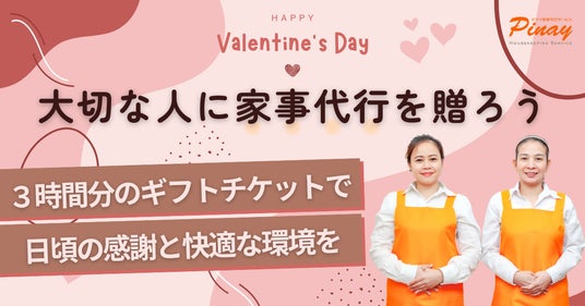 フィリピン人専門の家事代行「ピナイ家事代行サービス」を運営する株式会社ピナイ・インターナショナル(本社:東京都目黒区 代表取締役:茂木哲也)は、バレンタインデーにあわせてギフトに使える家事代行チケットを販売いたします。