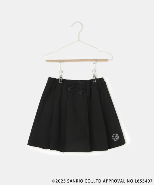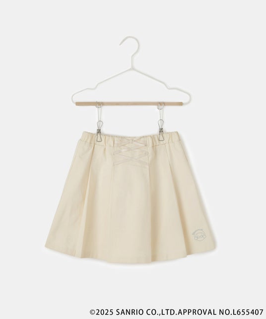 裾の下側に「シナモロール」と「クロミ」の刺繍が入っています。安心のインナーパンツ付きで、ウエストゴムは調整可能です。