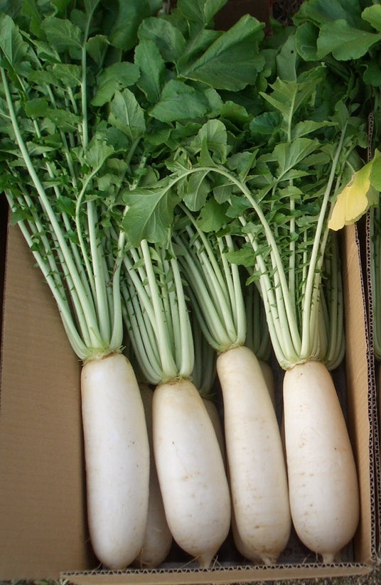 田辺大根の形質はハムのようにずんぐりとしてやや下膨れ。白首で立派な葉が育ちます。生で食べると辛みがあり、煮ると甘みに変わります。多様な料理に適し、愛された田辺大根ですが、戦後市場から姿を消し幻の野菜となります。理由は、生産地域の都市化、鉄道の発達で他府県から大量の大根が安く入荷される。伝統野菜の特徴で収穫された大根の形や大きさが不揃いで市場商品にしにくいなどがあります。消滅したと思われた田辺大根ですが2000年に当時の大阪府立農林技術センターで種子が保存されていることが分かりました。「田辺大根ふやしたろう会」のメンバーが元の地域で復活させたいと種子を分けてもらい、田辺を中心に周辺地域の学校や人々に栽培してもらい復活運動に取り組んでもらいました。現在では「なにわの伝統野菜」のひとつとして見事に復活しました。(大阪市東住吉区ホームページより抜粋)