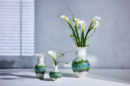 「カラー」シリーズ カラーの象徴的な曲線を花器のフォルムに反映し、茎の美しさを引き立てるため、口を細く仕上げました。釉薬は繊細なグリーンのレイヤーを重ねることで、奥行きのある幻想的な表情を演出しています。