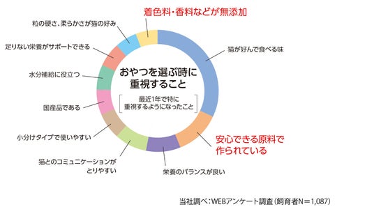 おやつを選ぶ時に重視すること(最近1年で特に重視するようになったこと)調査では、「猫が好んで食べる味」だけではなく、「安心できる原料で作られている」「着色料・香料などが無添加」というペットの健康も重視する回答の割合も多い傾向にあります。「無一物舌福(ぜっぷく)」は、おいしさや食べやすさはもちろん、食品同様の厳しい基準で作られた安全・安心なペットフードです。