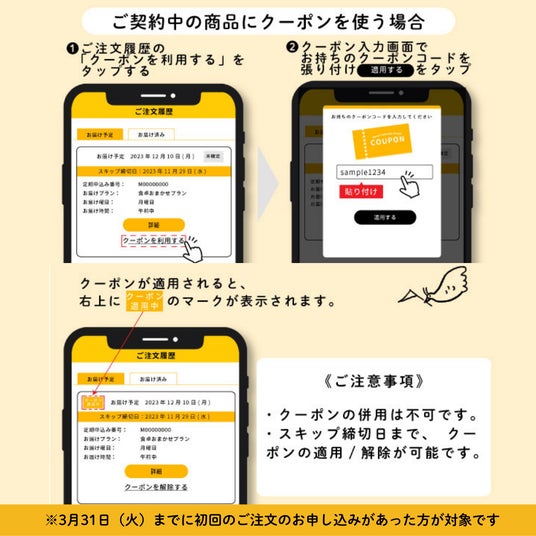 初回のご注文後メールにてクーポンを配布いたします。クーポンコードは2回目のご注文からご利用いただけます。