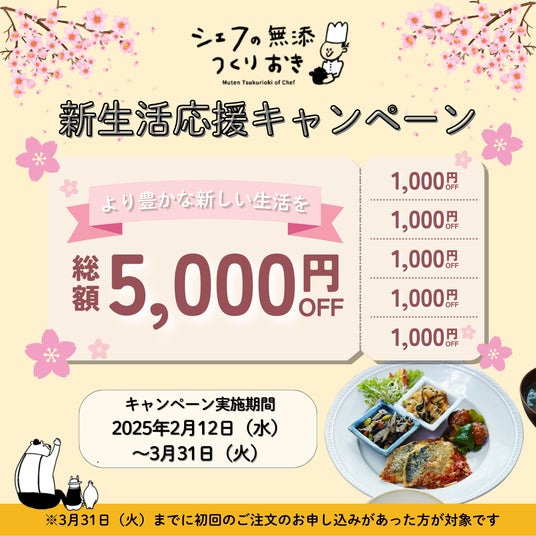【新生活は“ご飯どうする問題”が発生!?】シェフの無添つくりおきが、新生活が始まる方へ向けた「新生活応援キャンペーン」を実施