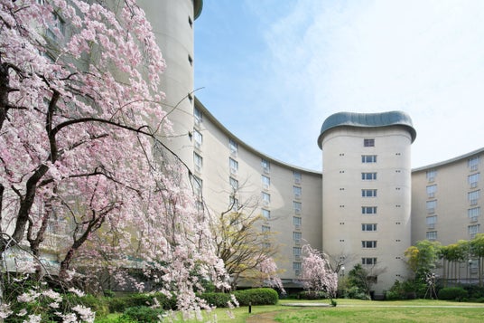 村野藤吾の「洋」の意匠に包まれて咲くホテル棟中庭の桜と、日本庭園の和の桜を一度にお楽しみ